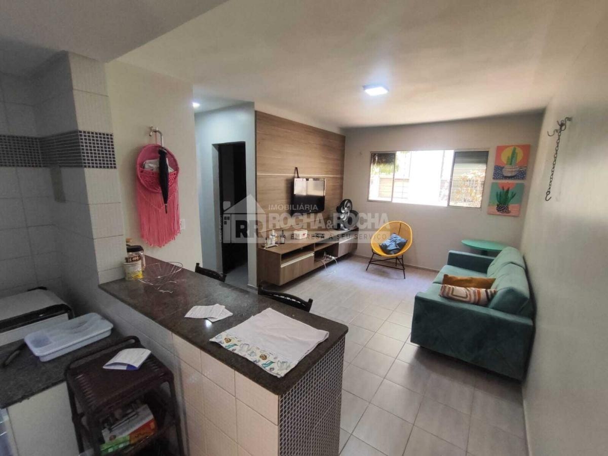 Apartamento residencial mobiliado, conta com sala de estar/jantar com sofá, hack, cozinha com pia em inox,fogão, geladeira, maquina de lavar, armarios, possui 02 quartos com cama, guarda roupa, 01 WC social com pia de granito, área de serviço, forro de gesso e laje, 01 vaga de garagem. Condomínio com salão de festas, piscina, sem elevador, playground e churrasqueira.